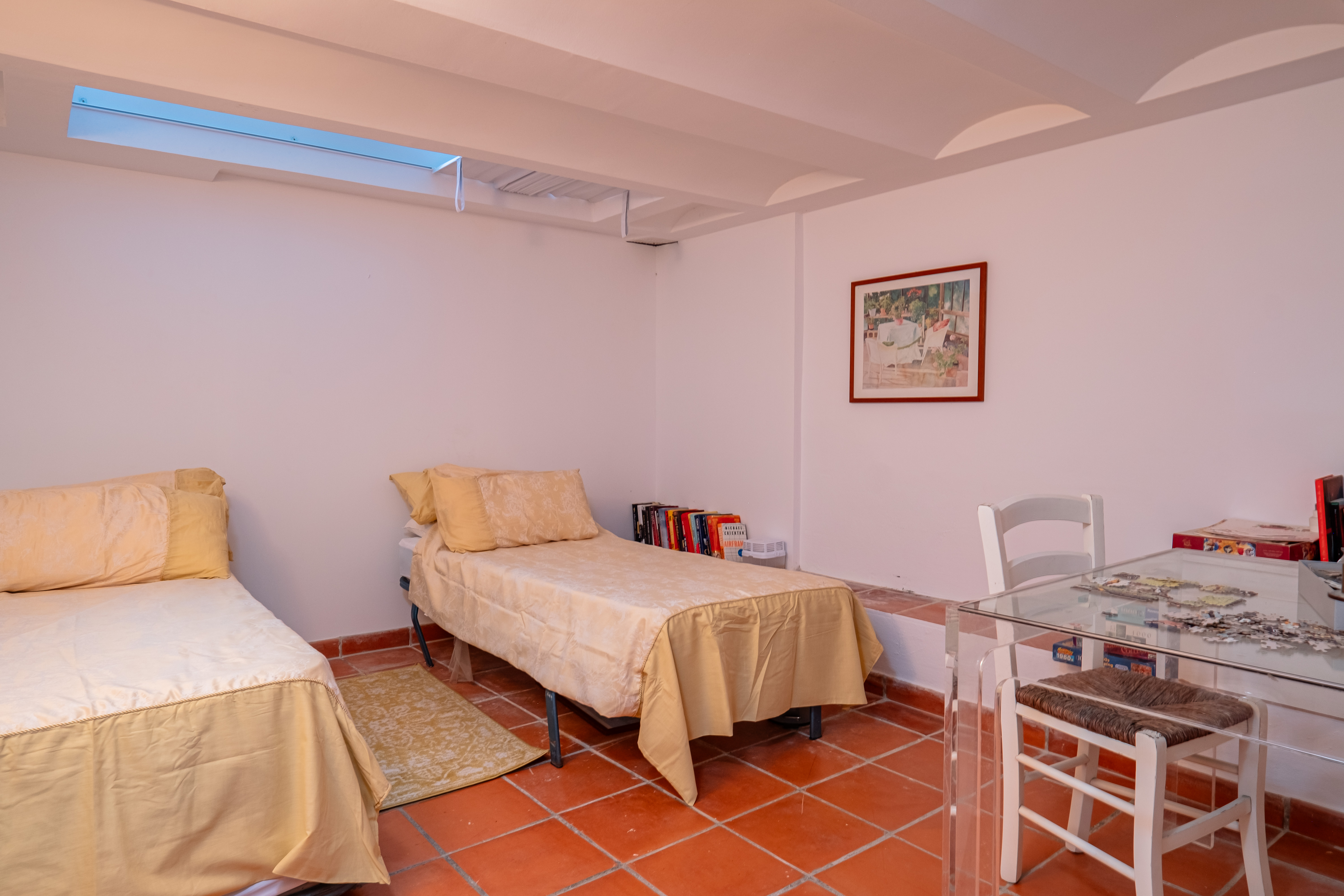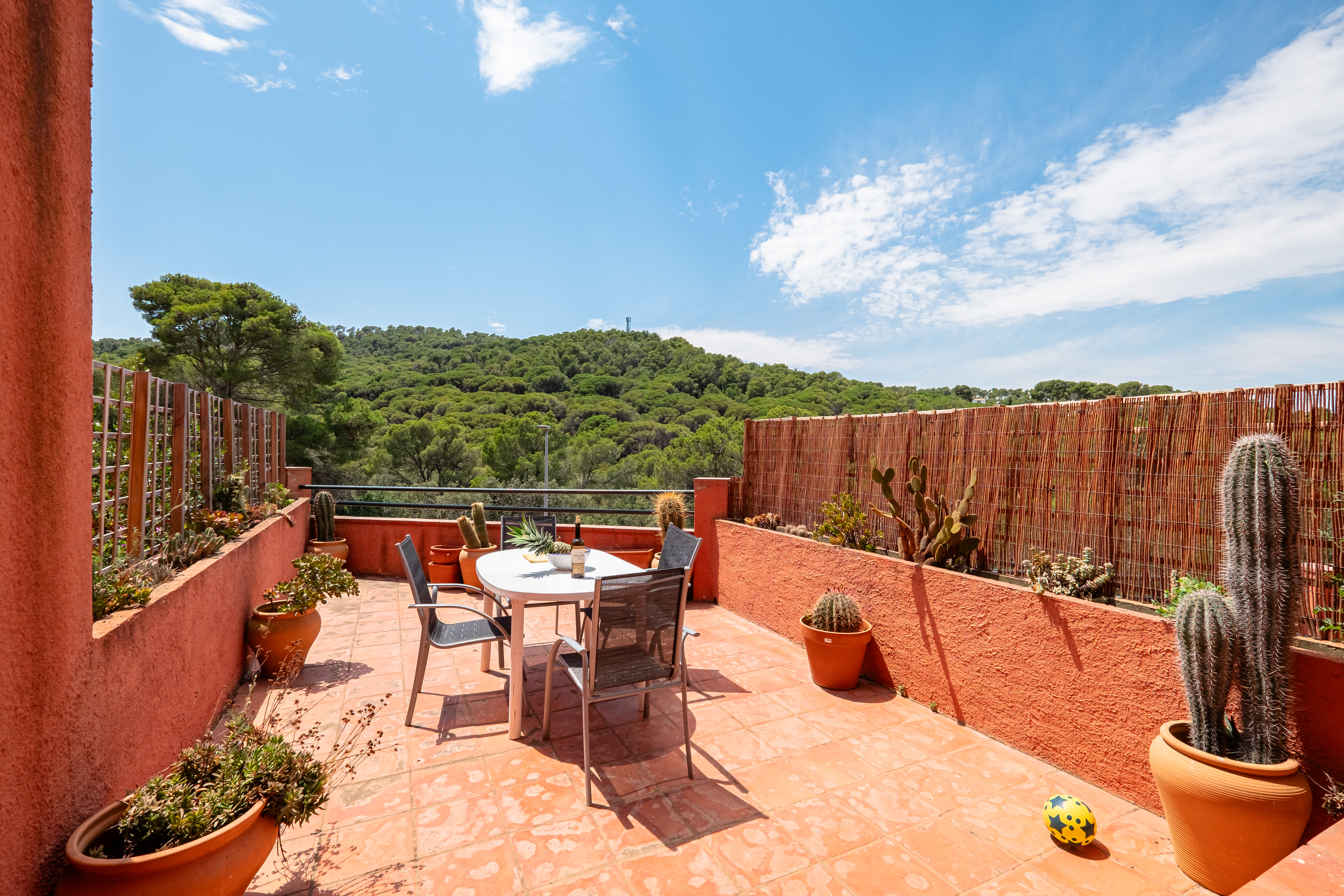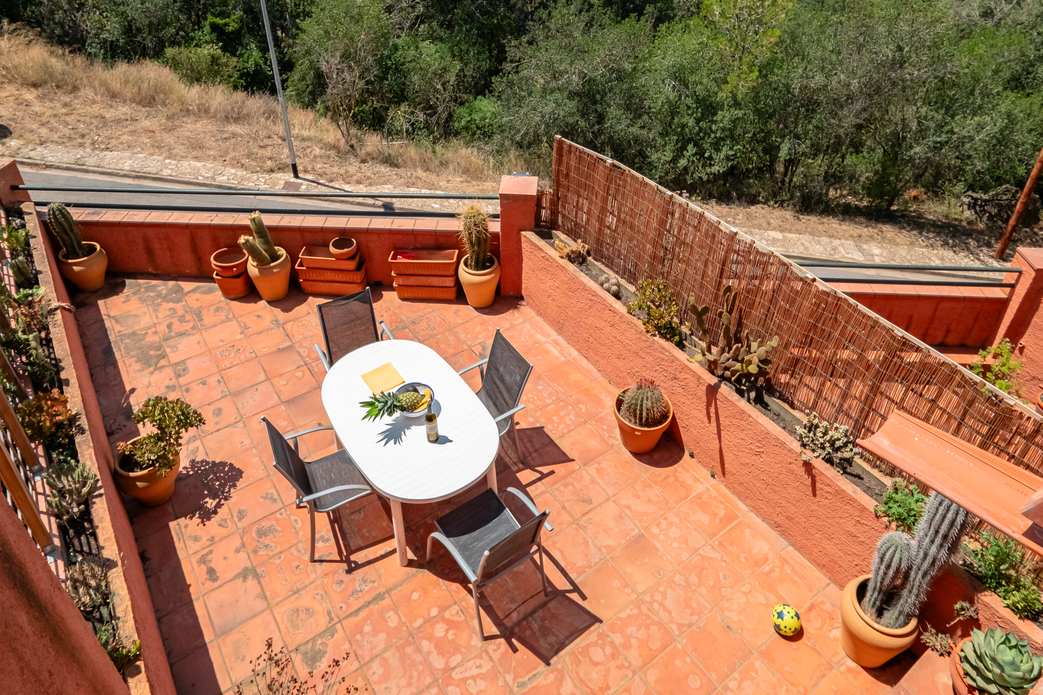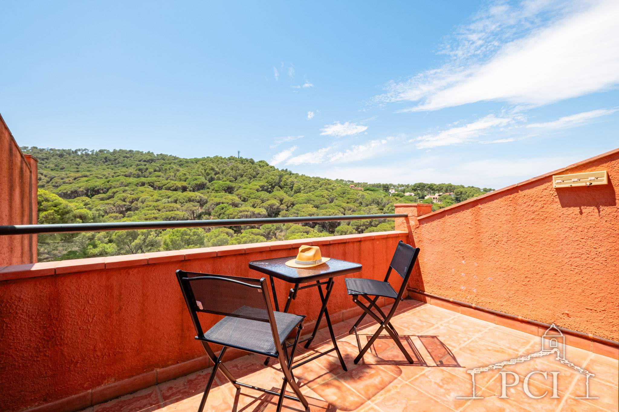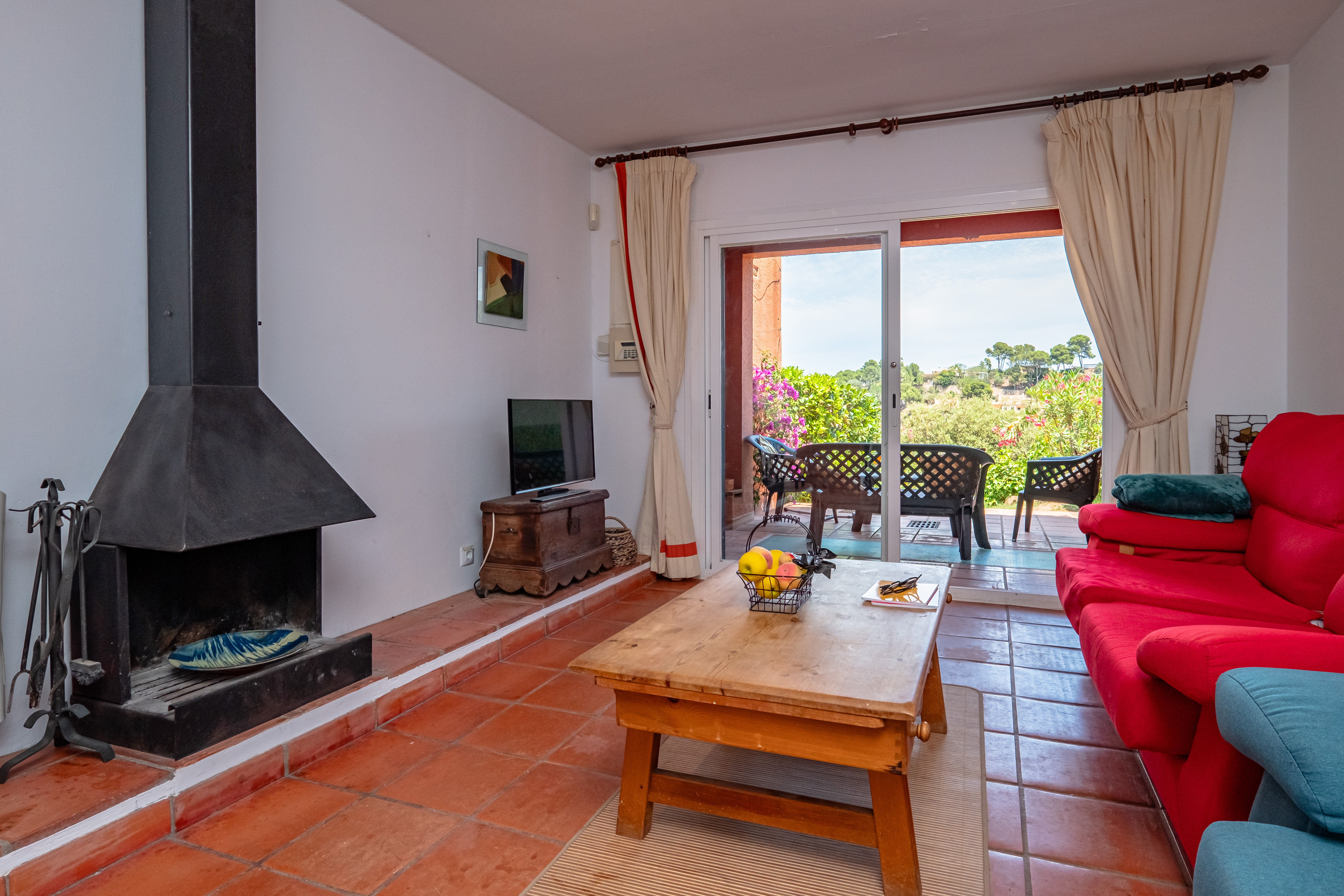 From the living room, there is access to the upper floors where there are two additional double bedrooms, each with a private terrace. One of the bedrooms has sea views, while the other has forest views. Two bathrooms, one of which has a shower, serve these rooms.