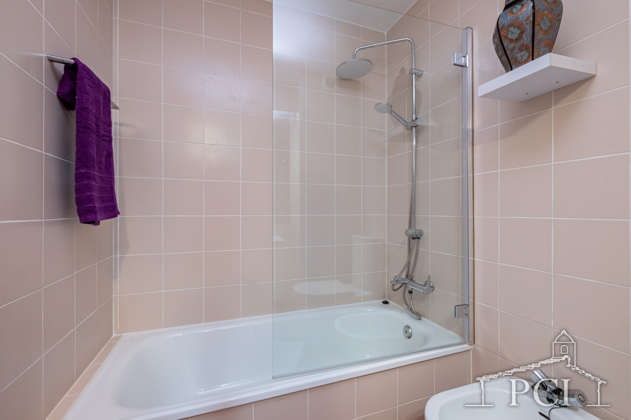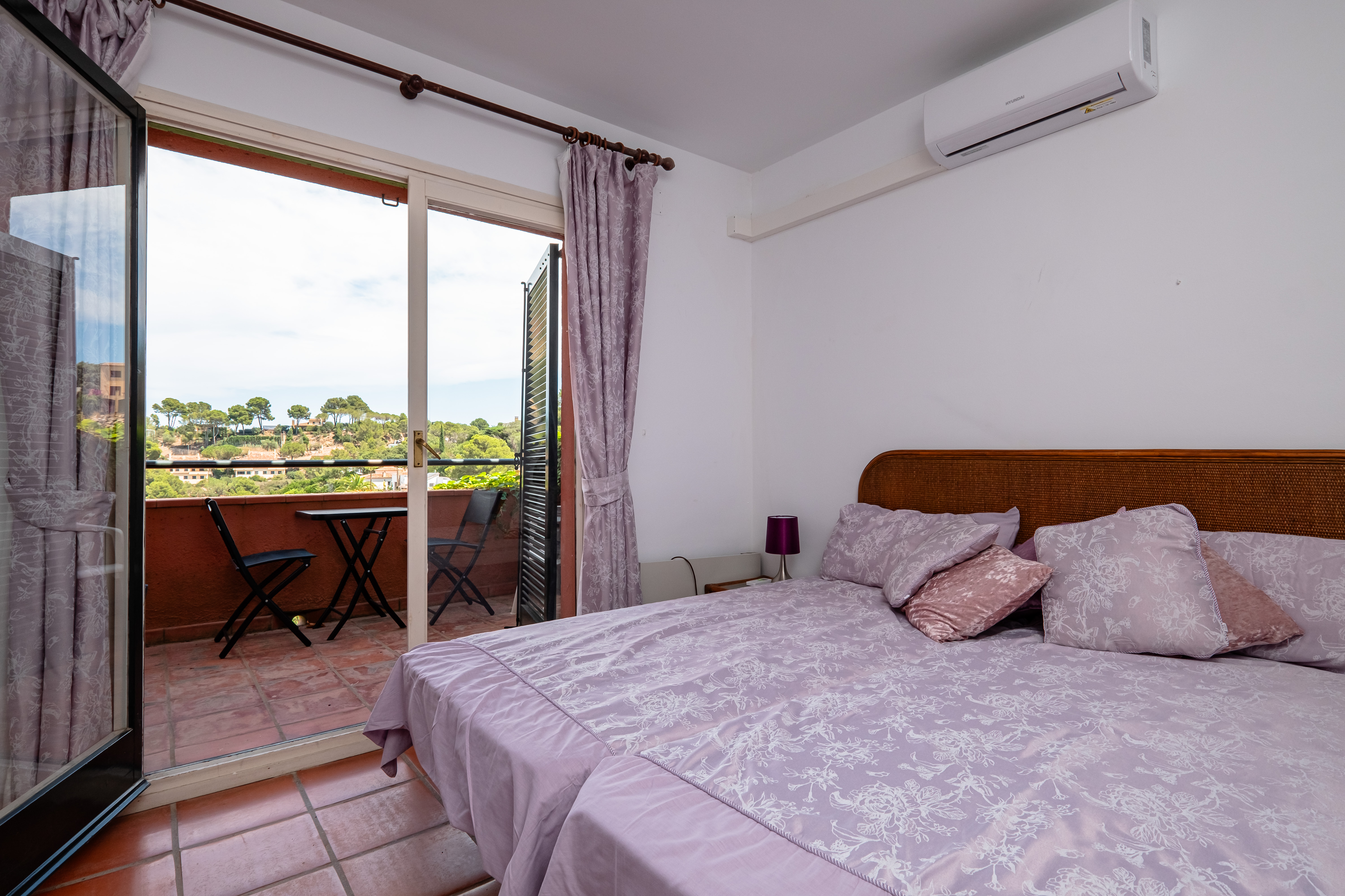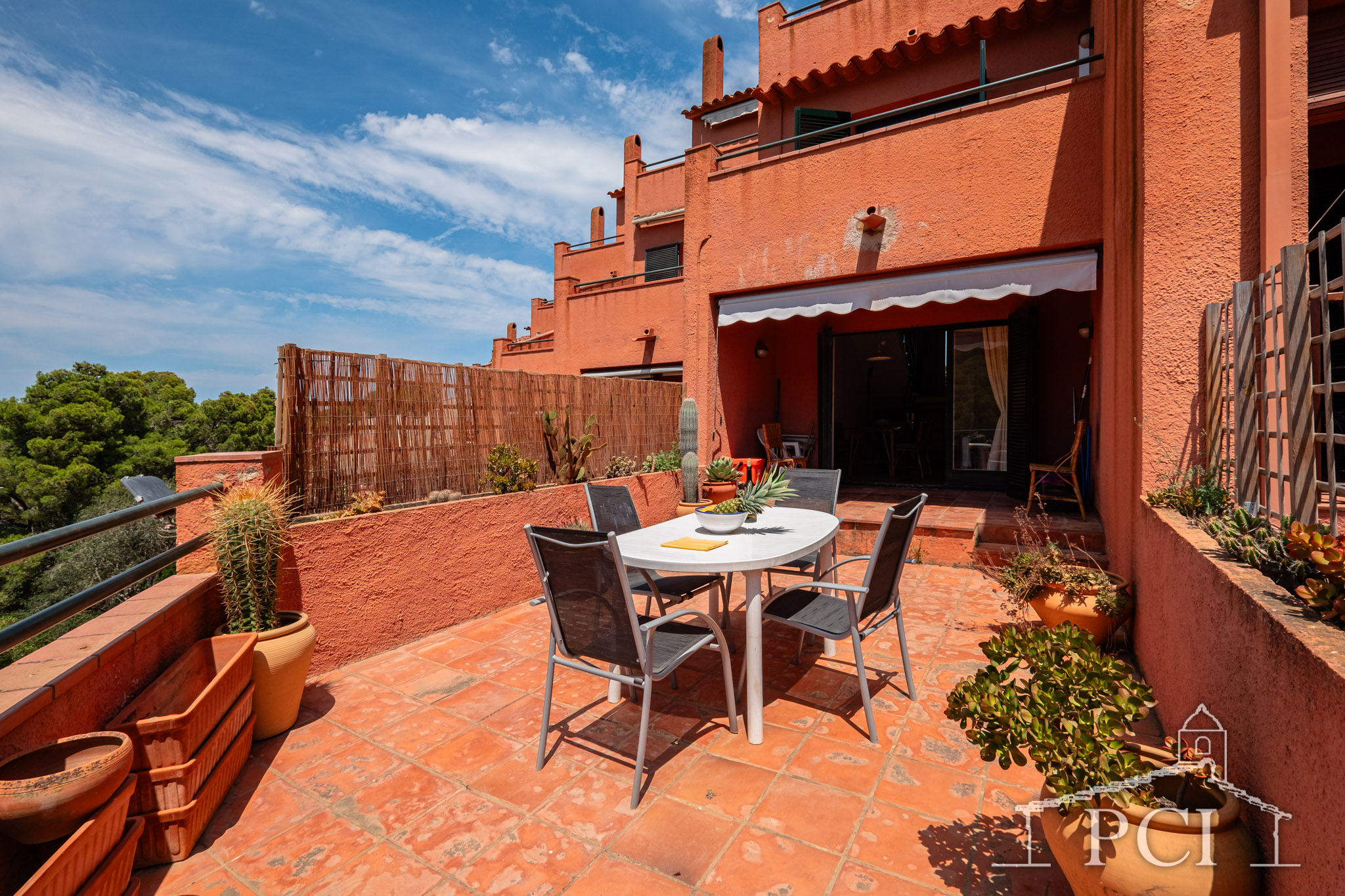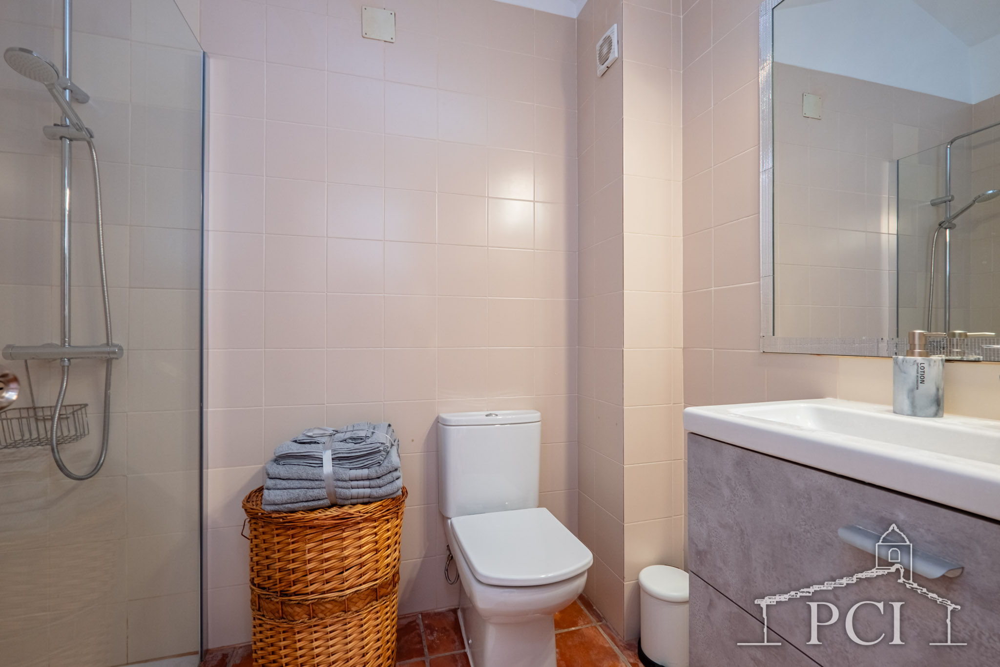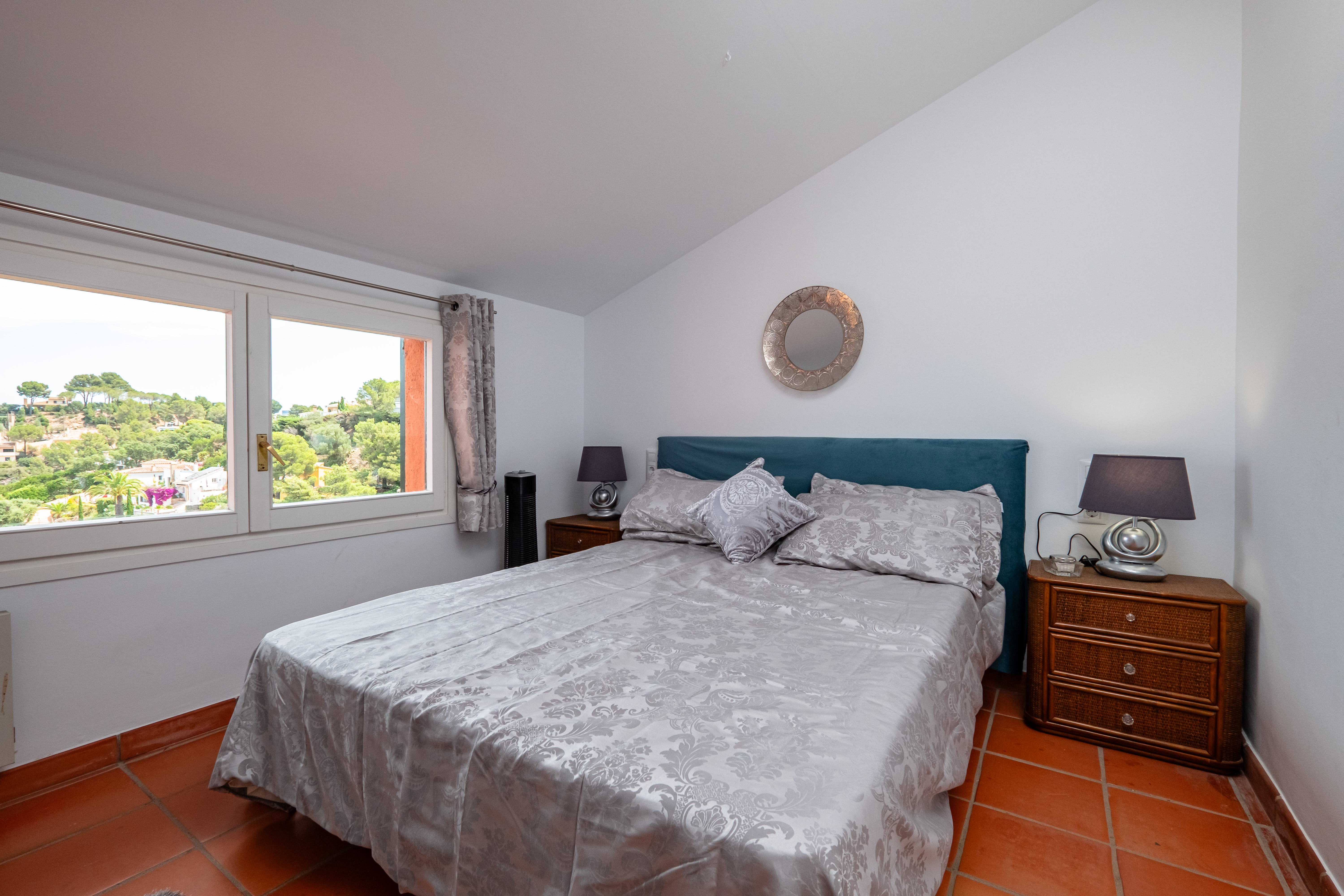From the living room, there is access to the upper floors where there are two additional double bedrooms, each with a private terrace. One of the bedrooms has sea views, while the other has forest views. Two bathrooms, one of which has a shower, serve these rooms.