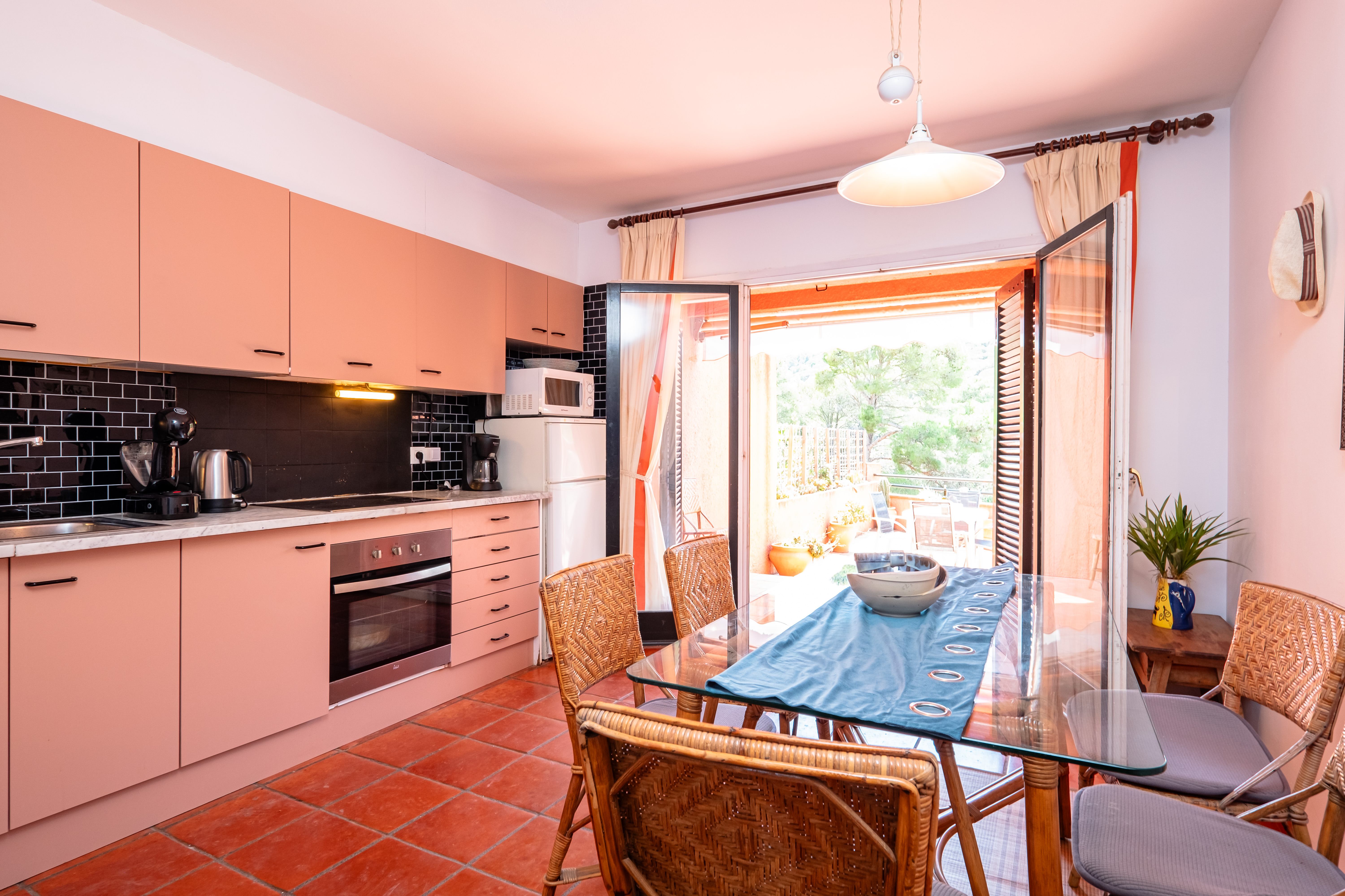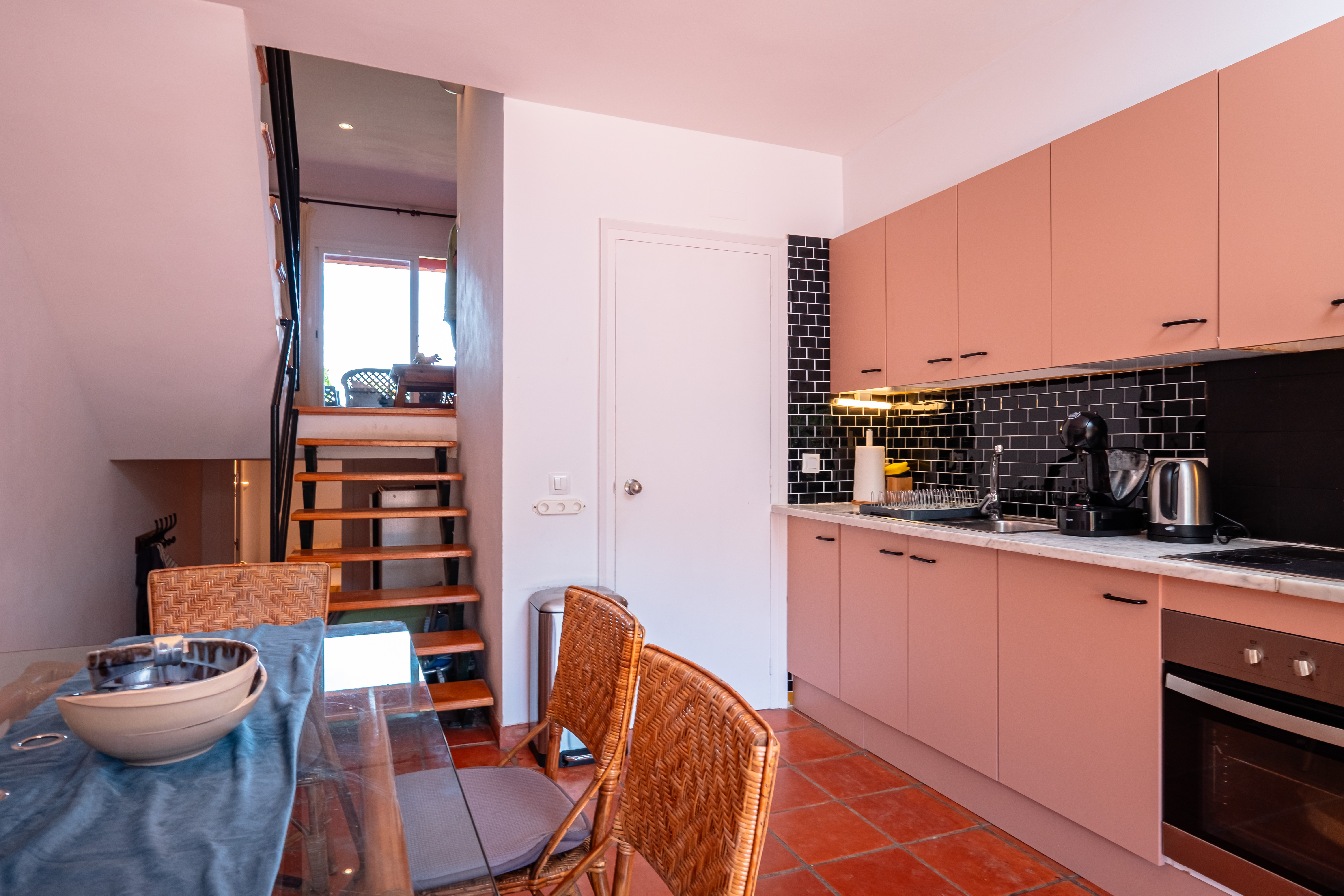 A staircase leads up to a spacious and well-equipped kitchen, equipped with a microwave, dishwasher and washing machine, as well as a dining room and access to a west-facing terrace. From the kitchen, another staircase leads to a double bedroom.